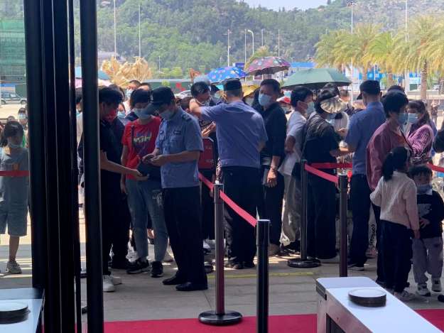 “五一”期間,潮博中心推出“潮博文創(chuàng)”市集活動,吸引大批游客到館參觀。潮博中心在保障游客有序入場同時嚴(yán)格抓好疫情防控工作,落實安保人員核驗疫情防護措施,做到游客進(jìn)場“場所碼必查、行程卡必驗、口罩必戴”,確保游客安全參觀。