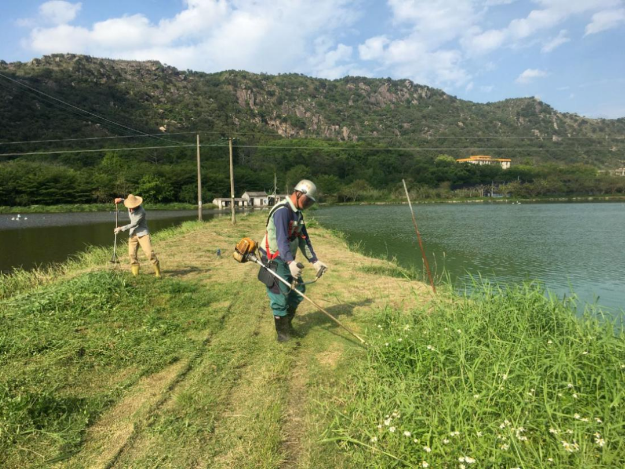 東山湖農(nóng)場工作人員仍堅守魚池喂養(yǎng)一線,他們頭頂烈日,早出晚歸,變化的是溫度,不變的是初心和使命。割草、投魚料、魚池巡查、堤壩日常維護、利用增氧機給池塘增氧……