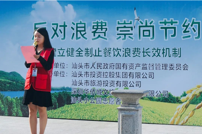 活動(dòng)中,汕頭市旅游投資有限公司副總經(jīng)理羅菲向廣大市民、游客朋友及餐飲經(jīng)營(yíng)單位宣讀“反對(duì)浪費(fèi)、崇尚節(jié)約”倡議書。