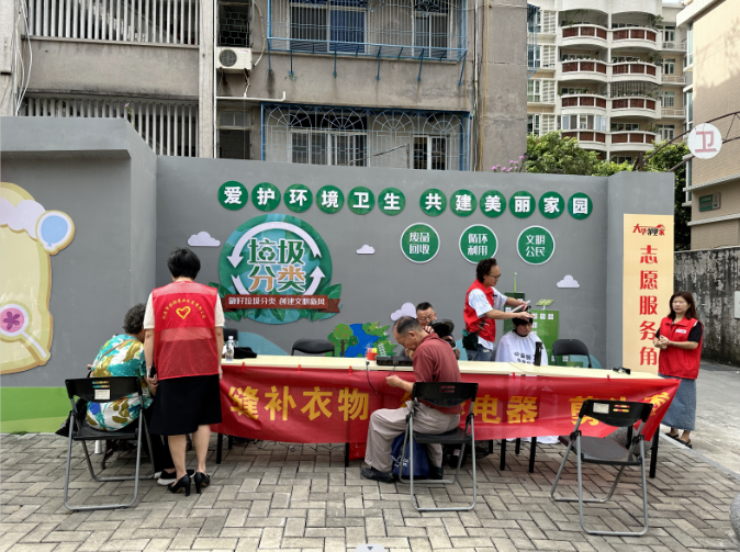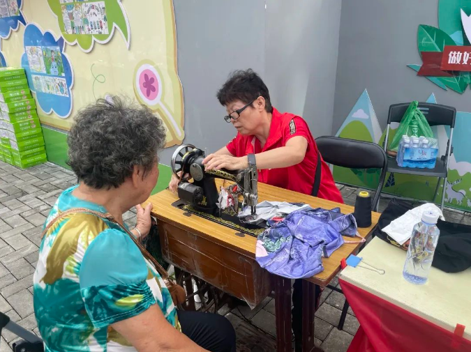 在志愿服務(wù)角,志愿者耐心為社區(qū)居民免費(fèi)剪發(fā)、修理電器、縫補(bǔ)衣服等。