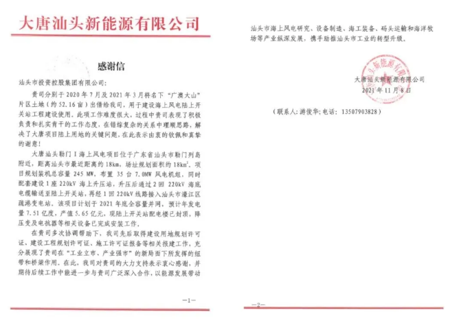 11月8日,汕頭市投資控股集團(tuán)有限公司收到了來自大唐汕頭新能源有限公司的感謝信。為加快推進(jìn)大唐海上風(fēng)電項(xiàng)目(計(jì)劃總投資50.77億元)落地,投控集團(tuán)提供廣澳大山12.117畝自有土地作為大唐風(fēng)電陸上開關(guān)站,并提供40畝臨時(shí)用地解決大唐風(fēng)電埋置電纜鏈接陸上開關(guān)站的實(shí)際問題。此項(xiàng)工作難度很大,大唐汕頭新能源有限公司來信表示衷心感謝,并充分肯定了投控集團(tuán)的敬業(yè)和干事創(chuàng)業(yè)的熱忱,稱:“貴司表現(xiàn)了積極負(fù)責(zé)和扎實(shí)肯干的工作態(tài)度,在錯(cuò)綜復(fù)雜的關(guān)系中理順?biāo)悸?,解決了大唐項(xiàng)目陸上用地的關(guān)鍵問題,在此表示由衷的欽佩和真摯的謝意!......充分展現(xiàn)了貴司在‘工業(yè)立市、產(chǎn)業(yè)強(qiáng)市’的新局面下發(fā)揮出紐帶和橋梁作用?!?/span>