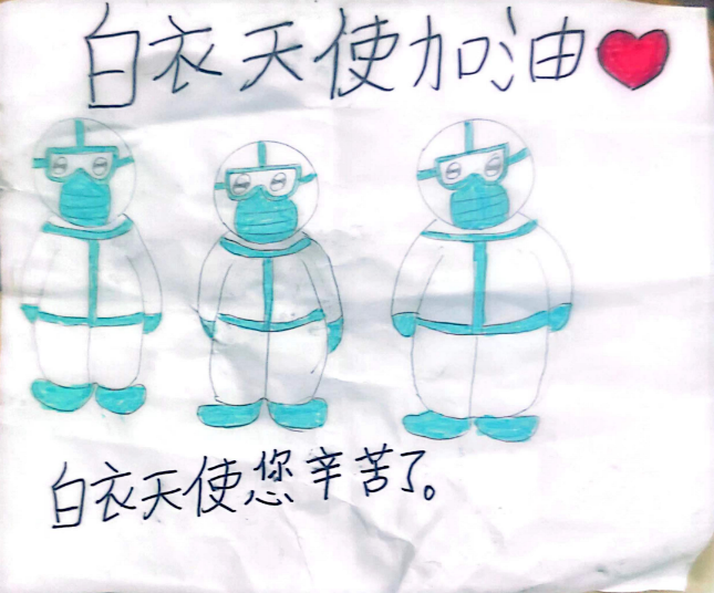 “謝謝叔叔、阿姨每天給我們做核酸,您們辛苦了!這幅畫(huà)送給您們?!?1月8日上午,潮南區(qū)陳店鎮(zhèn)封控區(qū)的汕投控集團(tuán)志愿者在分組入戶(hù)采樣核酸的時(shí)候收到了來(lái)自居民小朋友的手繪圖畫(huà),用自己的小手繪出他們的心里話,用屬于孩子獨(dú)有的方式表達(dá)了對(duì)志愿者們的感謝。畫(huà)面上用三個(gè)憨態(tài)可掬的“大白”,記錄了封控區(qū)階段來(lái)入戶(hù)采樣核酸的工作組合,還用“白衣天使您辛苦了”“白衣天使加油”等文字致敬志愿者。