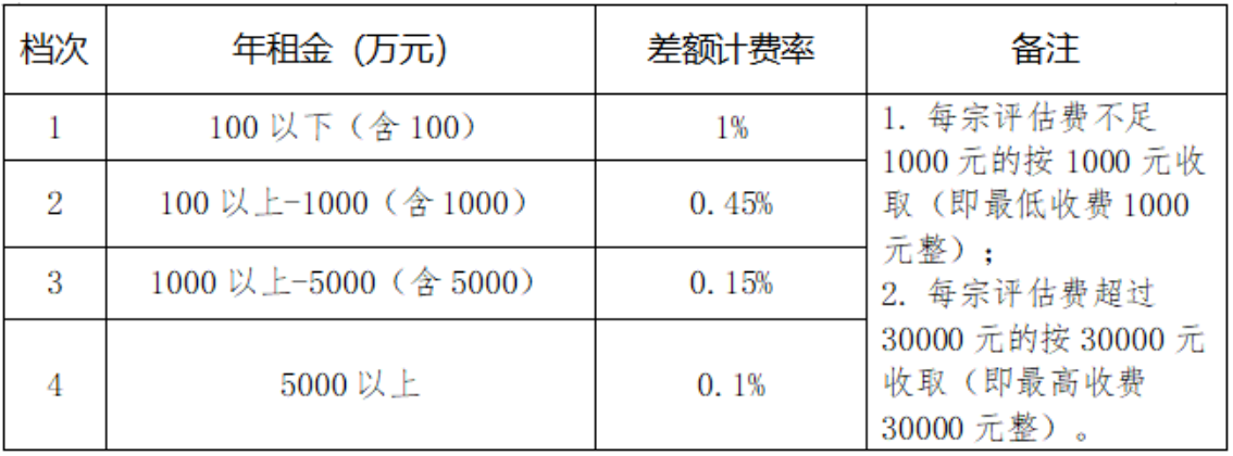 (一)物業(yè)出租/出借收費標(biāo)準(zhǔn)。評估機構(gòu)收費須以每宗出租/出借物業(yè)年租金評估值,參照《廣東省物價局關(guān)于資產(chǎn)評估收費有關(guān)通知》,按以下標(biāo)準(zhǔn)分段累計:
