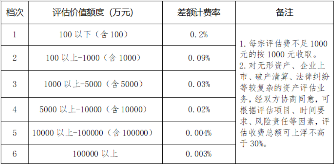 (二)轉(zhuǎn)讓、抵押等其他評估情形收費標(biāo)準(zhǔn)。評估機構(gòu)收費參照《廣東省物價局關(guān)于資產(chǎn)評估收費有關(guān)通知》中“計件收費標(biāo)準(zhǔn)”按20%折扣計費,即按以下標(biāo)準(zhǔn)分段累計: