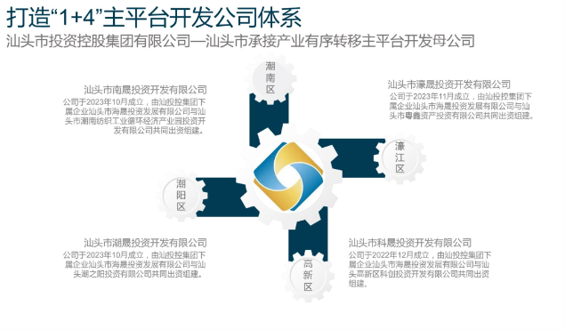 汕投控集團作為汕頭市承接產(chǎn)業(yè)有序轉移主平臺開發(fā)母公司,汕投控集團下屬企業(yè)汕頭市海晟投資發(fā)展有限公司(下稱海晟公司)作為實施主體,積極對接發(fā)改、工信、財政等部門以及主平臺各片區(qū)屬地政府、管委會,與高新區(qū)、濠江區(qū)、潮南區(qū)和潮陽區(qū)分別組建主平臺開發(fā)子公司,打造“1+4”主平臺開發(fā)公司體系, 上下聯(lián)動、凝聚共識、形成合力,統(tǒng)籌解決產(chǎn)業(yè)轉移工作中的難點堵點,主動承擔國資國企擔當。