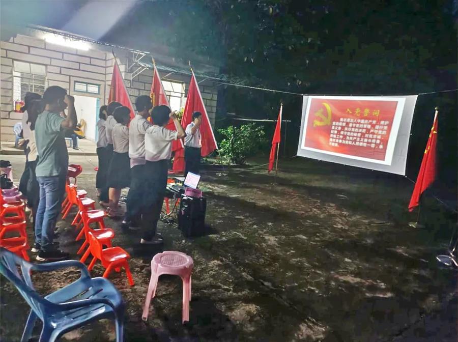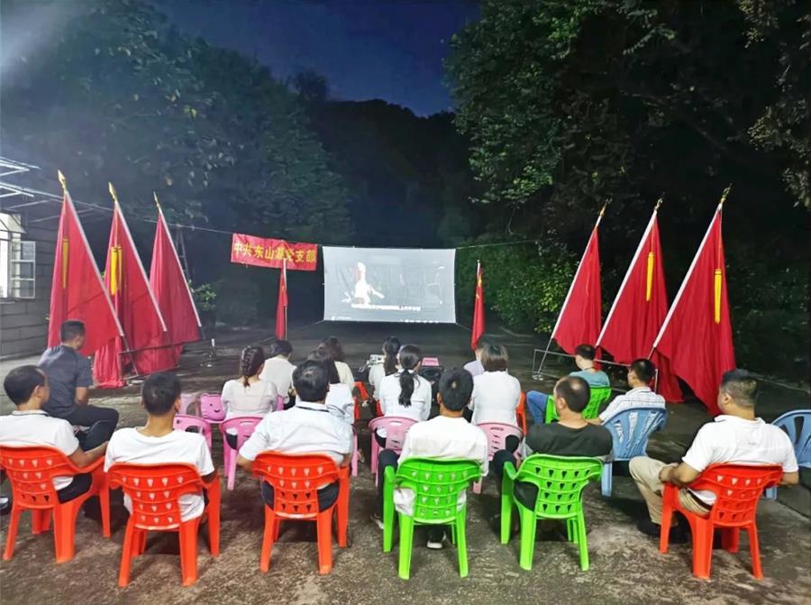 隨后,東山湖黨支部開展了“永遠跟黨走,精神永傳承”主題黨日活動。支部書記謝達堅帶領全體黨員在中共汕頭市委黨校舊址重溫了入黨誓詞,誓詞中每一句話鏗鏘有力、震動人心,宣示著全體黨員同志堅定的政治信仰和理想信念。為進一步豐富職工群眾精神文化生活,引導東山湖職工群眾深入了解紅色精神、激活紅色記憶、傳承紅色基因,東山湖黨支部黨員在烈日下工作了一個多小時,懸掛幕布、擺放桌椅,搭建起一個“移動影院”,為東山湖的職工群眾播放紅色影片《建國大業(yè)》,推動黨史學習教育深入群眾、深入基層、深入人心,獻禮建黨100周年。