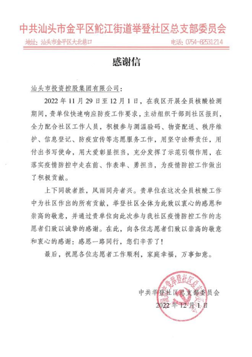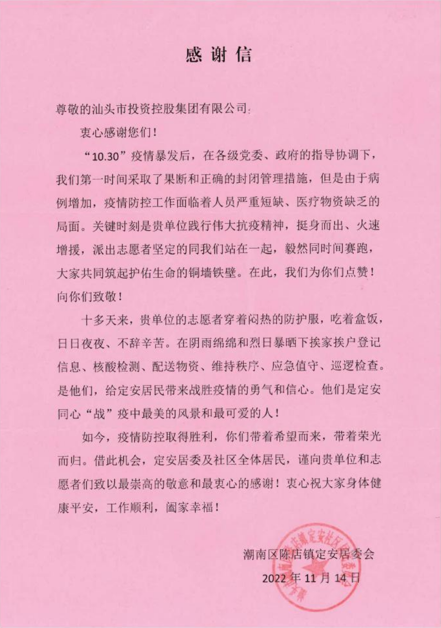 近日,市投控集團(tuán)接連收到來自安定居委、登舉社區(qū)的感謝信。一封封信件,細(xì)數(shù)著集團(tuán)公司支援人員的暖心之舉,傳遞著對(duì)支援人員沖鋒“疫”線、恪盡職守,積極參與社區(qū)疫情防控支援工作的感謝之情。